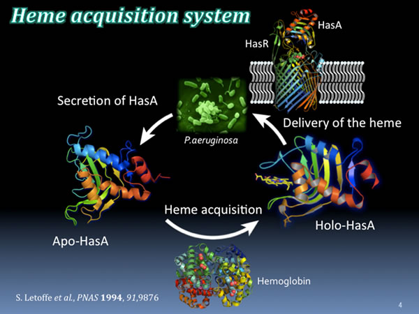 Bacteria have developed several iron scavenging mechanisms to assimilate sufficient amounts of iron to survive. One of systems developed by some Gram-negative pathogens such as Pseudomonas aeruginosa to acquire iron from their hosts involves secretion of a small protein hemophore known as HasA. The function of hemophores is to capture the heme, either from solution or from heme containing proteins, and to deliver it to the hemophore specific receptor, HasR. HasA binds heme so tightly (Ka = 5.3 × 1010 M-1) and delivers it to outer membrane recepter, HasR. HasA binds heme using two loops including histidine-32 and tyrosine-75 as ligands for the heme iron. The structure of the loop including histidine-32 is drastically changed after the heme binding. This loop appears to be important for the heme acquisition and release.
